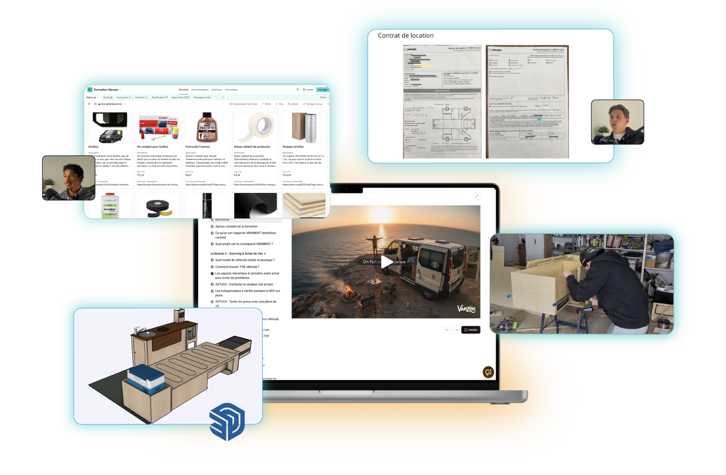 On t'accompagne dans le choix du fourgon, l'achat malin, et chaque étape de l'aménagement intérieur — de l'isolation à l'électricité. Même si tu n'as jamais tenu une perceuse.